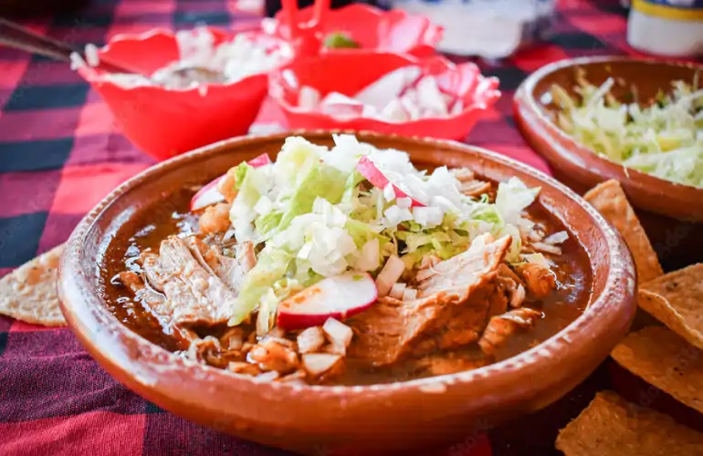 Servimos pozole con carne de cerdo o pollo, acompañado de tostadas, rábanos, lechuga, orégano y limón.